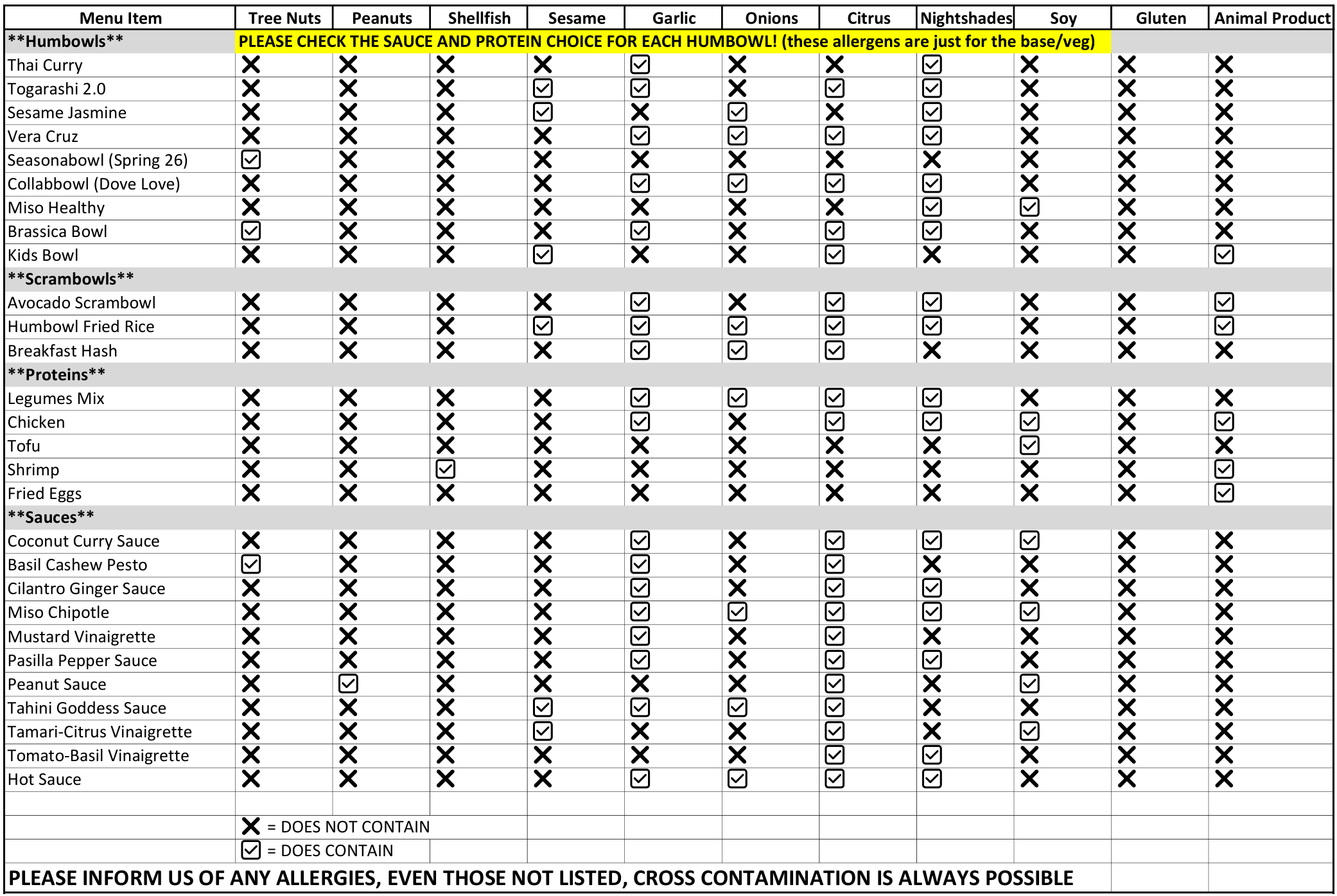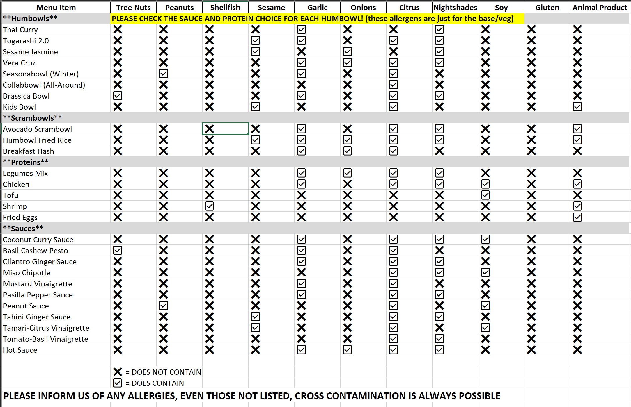 Please check the sauce and protein choice for each Humbowl! Humbowls only list allergens that include the rice and veggies. That’s because the sauces and proteins are interchangable.